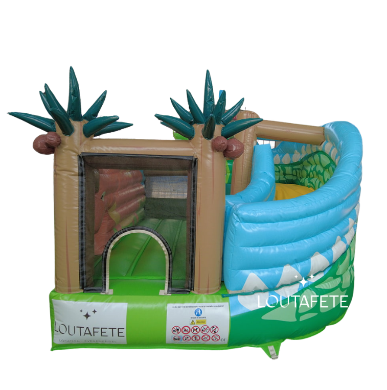 Avec son format 3,5 × 3 mètres et son toboggan intégré, elle est idéale pour les petits espaces et les premières aventures ludiques.