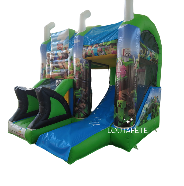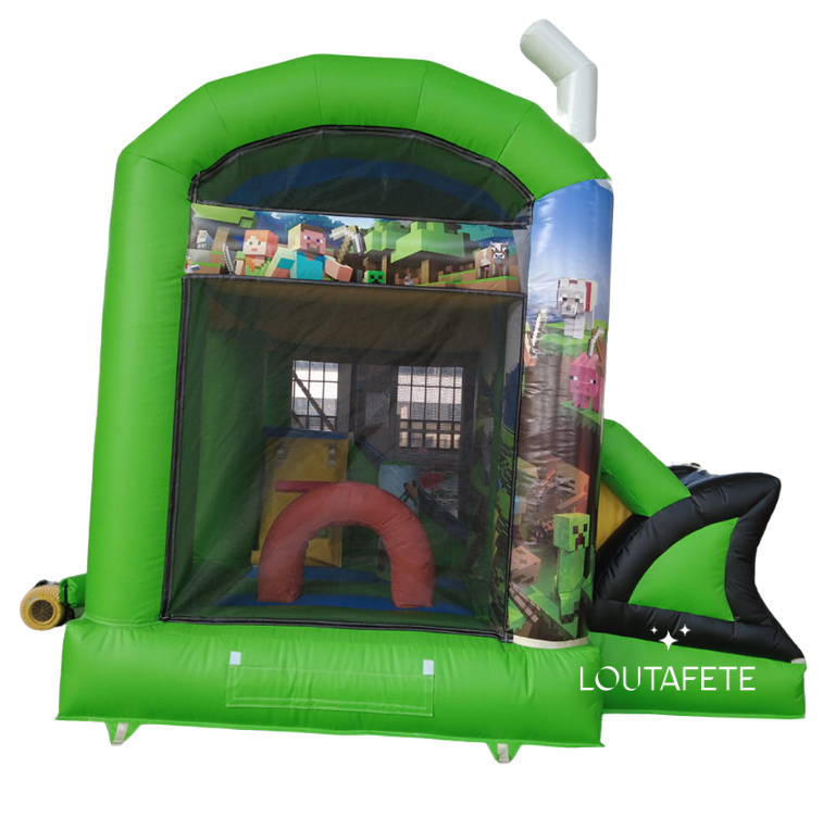 Ce superbe château sur le thème de MINECRAFT peut accueillir 10 enfants. Il possède un grand espace de jeu, des obstacles et un toboggan.